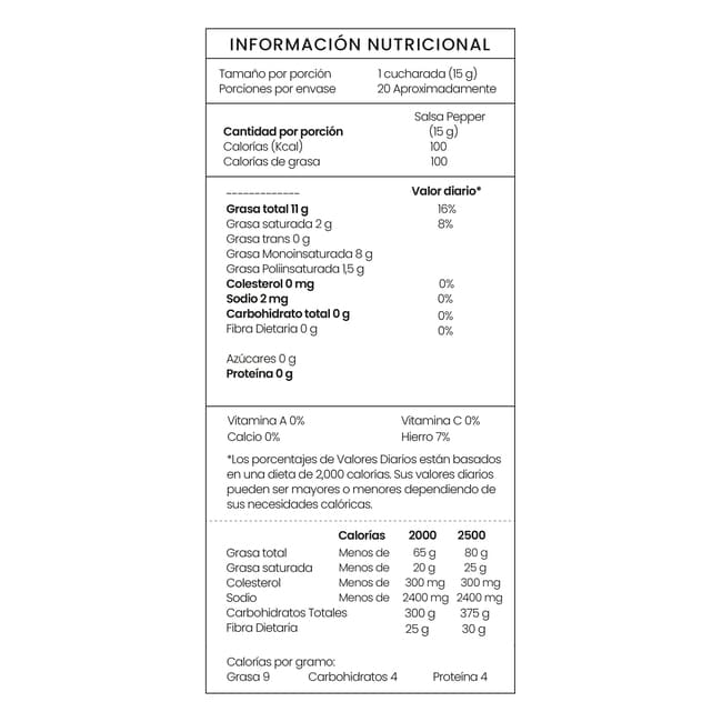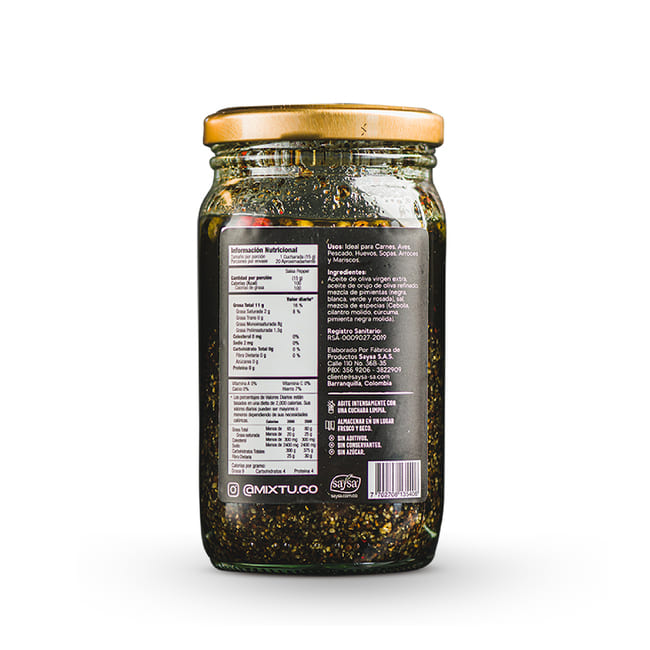 Aceite de oliva virgen extra, aceite de orujo de oliva refinado, mezcla de pimientas (negra, blanca, verde y rosada), sal, mezcla de especias (Cebolla, cilantro molido, cúrcuma, pimienta negra molida).